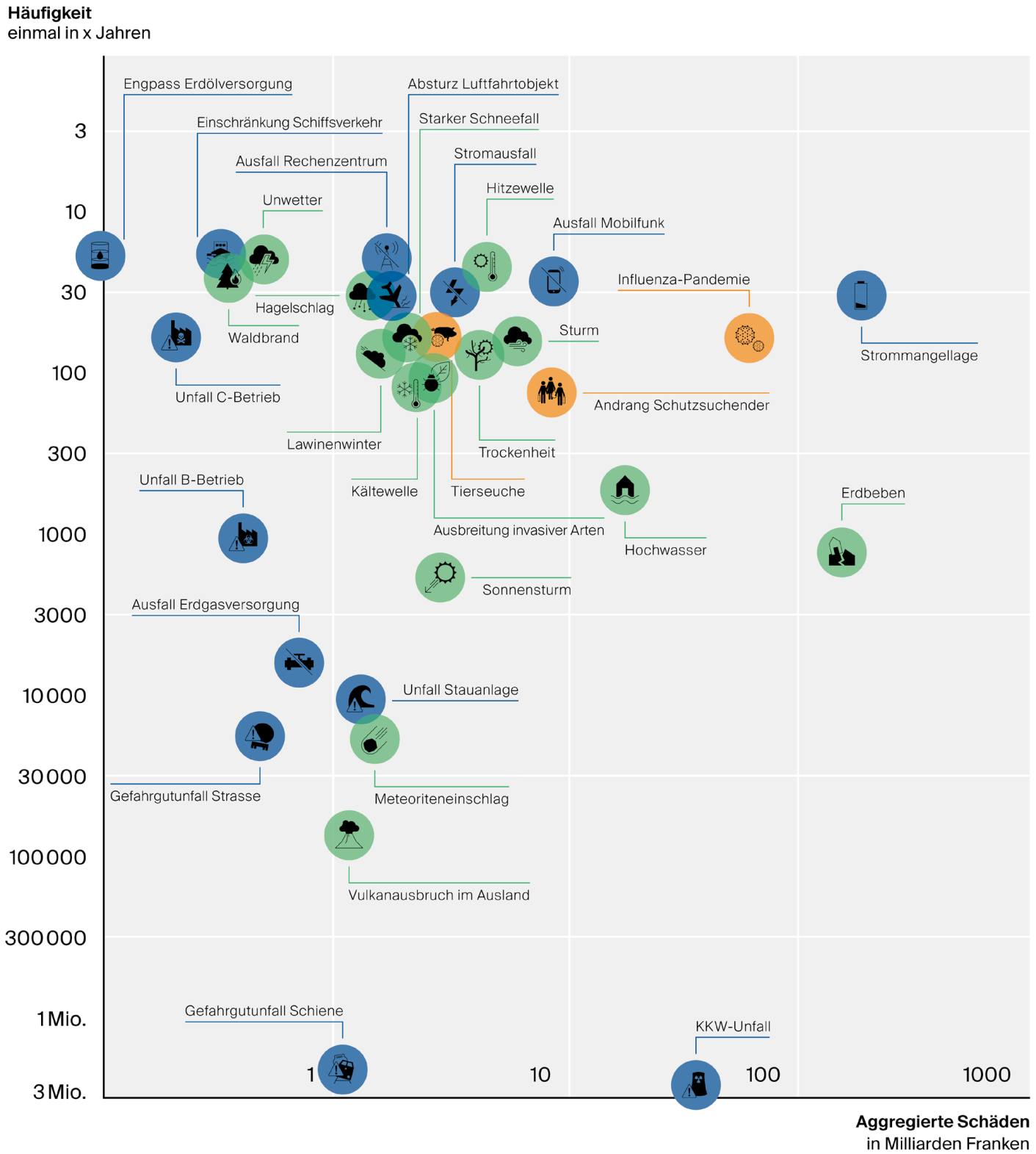 Das Bundesamt für Bevölkerungsschutz schätzt das Risiko einer Strommangellage auf «einmal in 30 Jahren». Ein Ausfall der Erdgasversorgung wird mit «einmal in 5000 Jahren» beziffert. Aufgrund der stark reduzierten Erdgaslieferungen aus Russland sind diese Szenarien vor allem im Winter 2022/23 sowie auch in den kommenden Jahren wahrscheinlicher geworden. Europa produziert rund 20% des Stroms mit Gaskraftwerken, wodurch bei Gasknappheit auch ein erhöhtes Risiko einer Strommangellage besteht. (Datenquelle: BP Statistical Review).